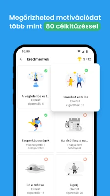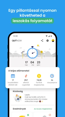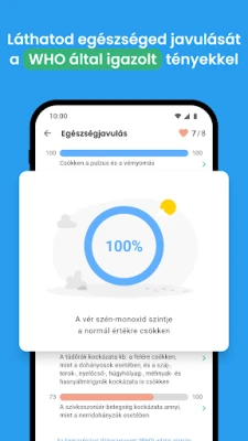A QuitNow kezdőképernyőjén azonnal láthatja a füstmentes élet előnyeit. Egyértelműen nyomon követheti, mennyi idő telt el az utolsó cigaretta óta, hány szálat nem szívott el, mennyi pénzt spórolt meg, és mennyi életet nyert vissza. Ezek a látványos statisztikák folyamatos motivációt adnak. Az Egészségügyi Világszervezet (WHO) adataira alapozva pedig részletes képet kap arról is, hogyan regenerálódik és erősödik a szervezete napról napra, bizonyítva a leszokás kézzelfogható, pozitív hatásait.