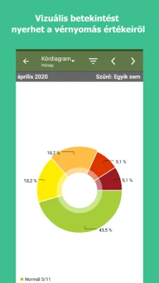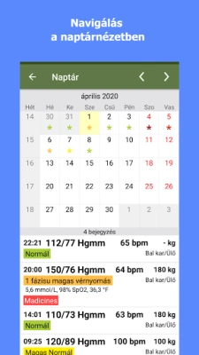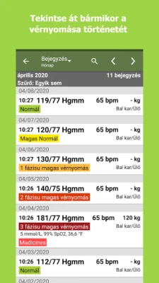 Az alkalmazás kifinomult funkciói révén a bejegyzett adatok azonnal átláthatóvá válnak. A kényelmes naptár nézet gyors betekintést nyújt a múltbéli mérésekbe, míg a testre szabható címkék segítenek rendszerezni az adatokat különböző szempontok szerint, legyen szó reggeli vagy esti mérésekről, gyógyszerezés előtti vagy utáni állapotról. Nincs többé szükség manuális számításokra: a rendszer automatikusan meghatározza a vérnyomás kategóriákat, és összefoglaló jelentést készít a maximális, minimális és átlagos értékekről. Kövesse nyomon a változásokat vizuálisan, így könnyedén felismerheti az időbeli mintákat és trendeket. Rugalmasan generálhat jelentéseket CSV, HTML, Excel vagy PDF formátumban, rendkívül egyszerűvé téve az adatok kezelését és archiválását.